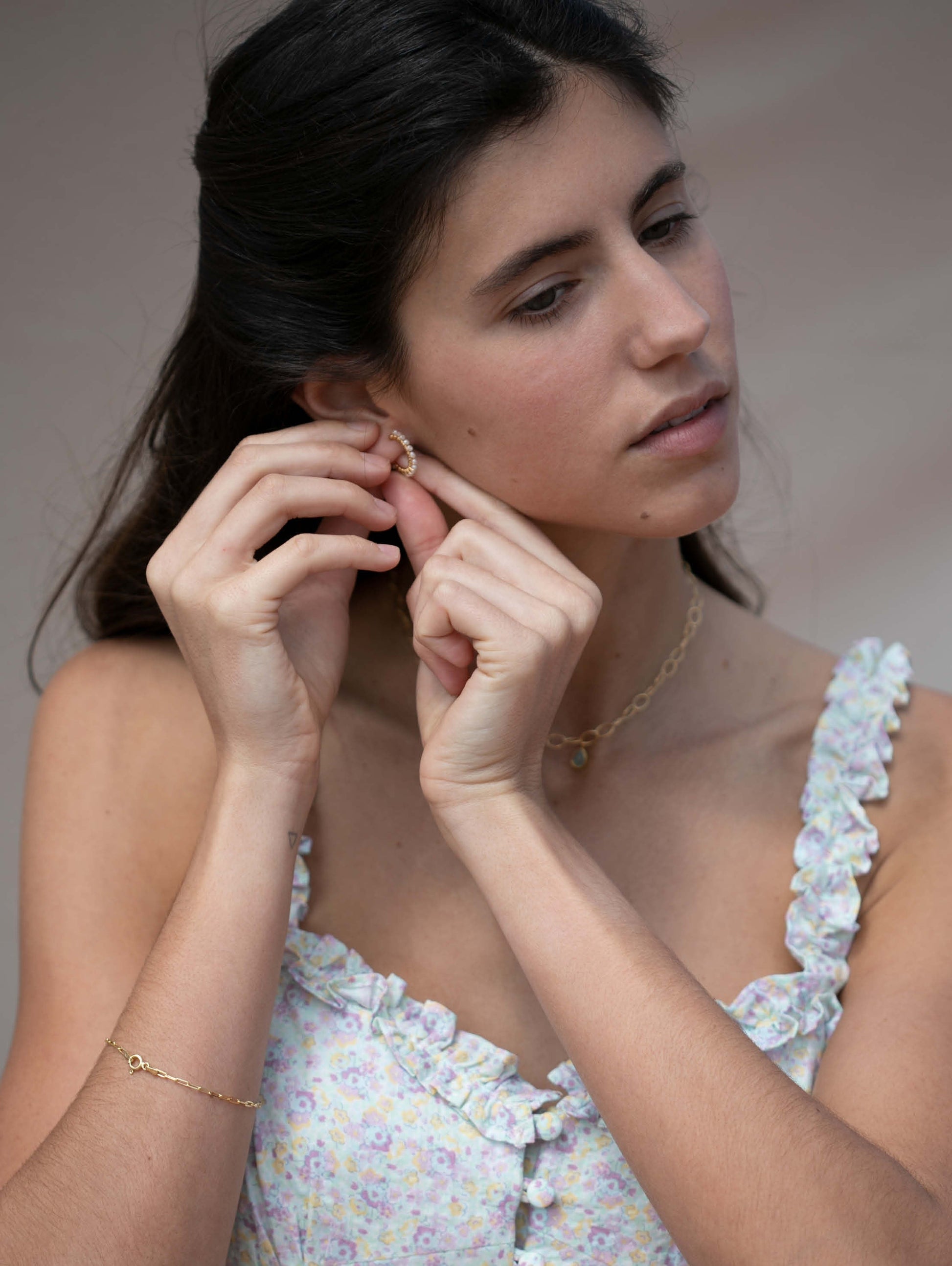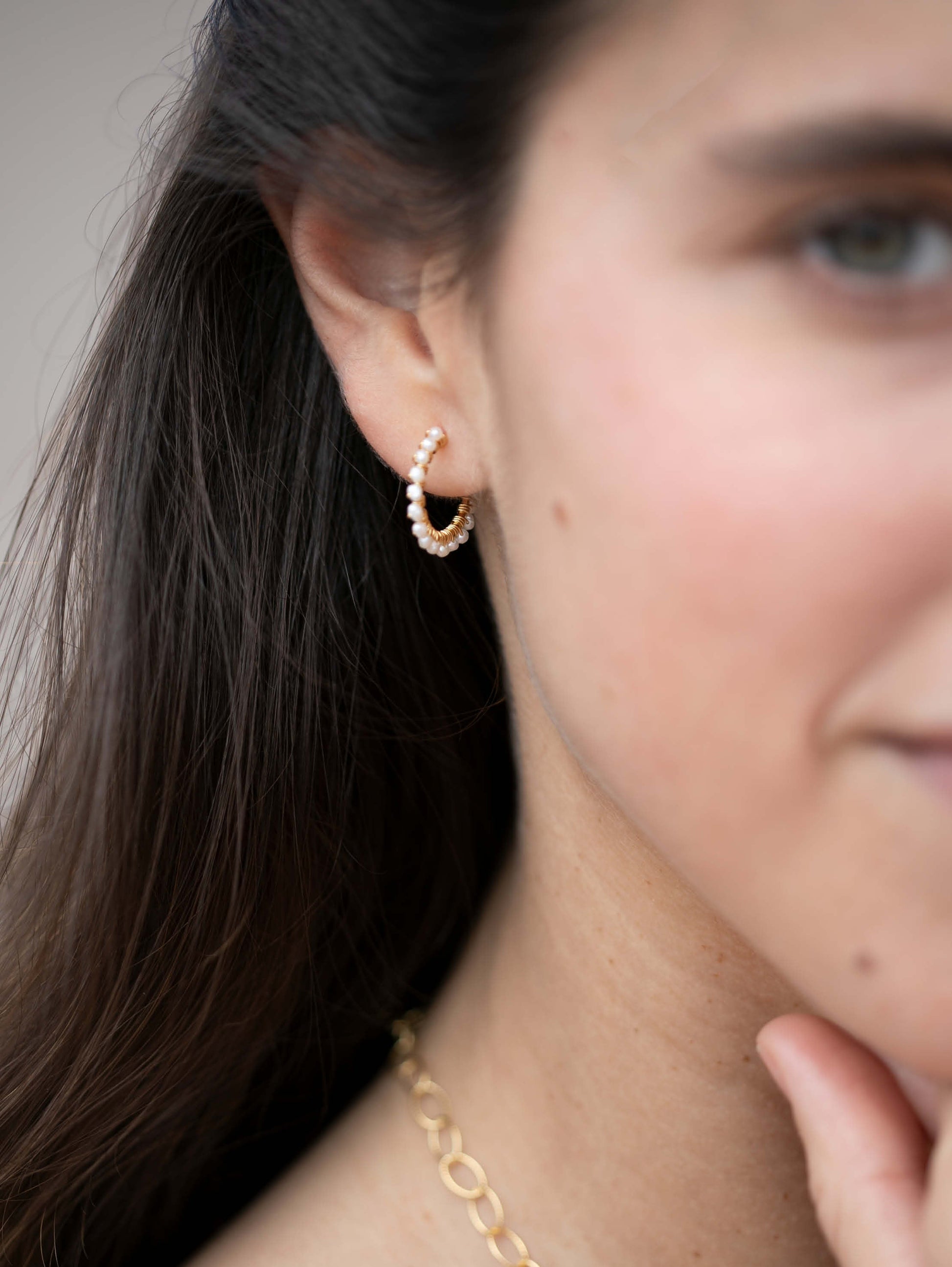 Cerceii ADÈLE är en raffinerad och feminin accessoar, handgjord av naturliga pärlor. De delikata pärlorna är fästa vid guldringen, vilket ger en unik och tidlös touch till stycket.