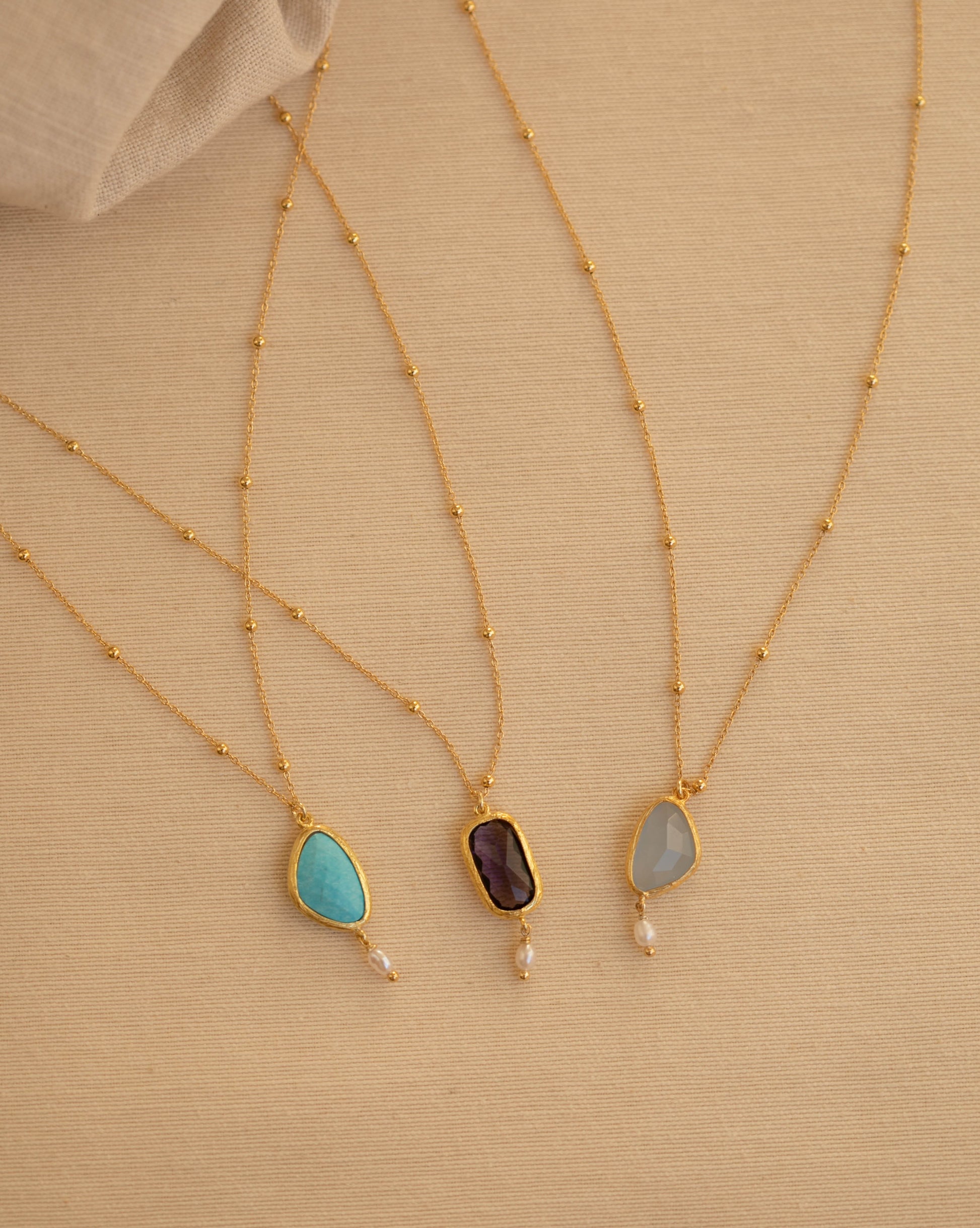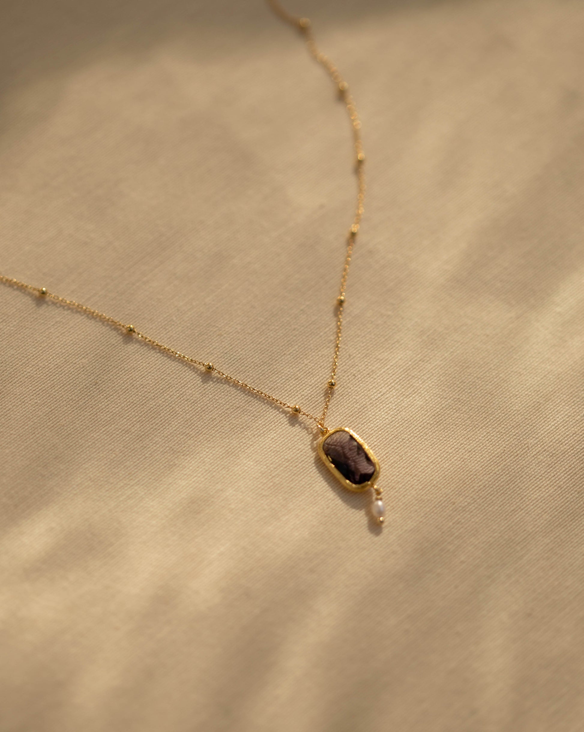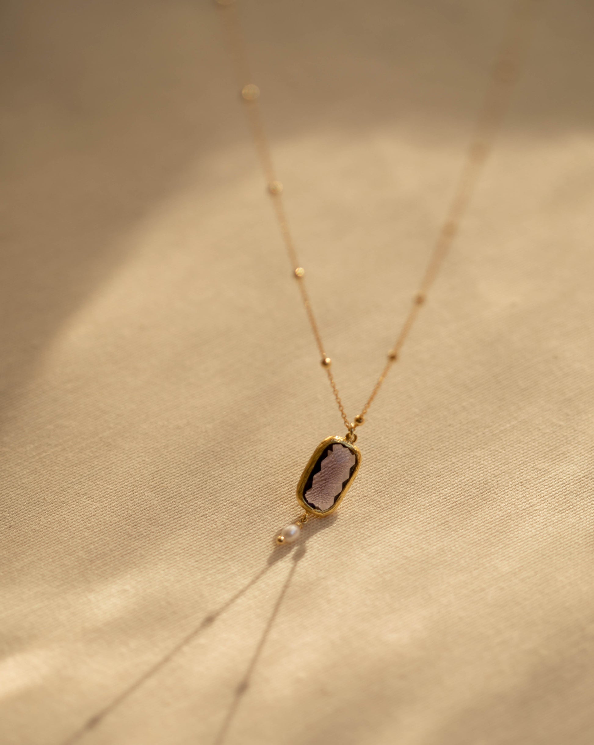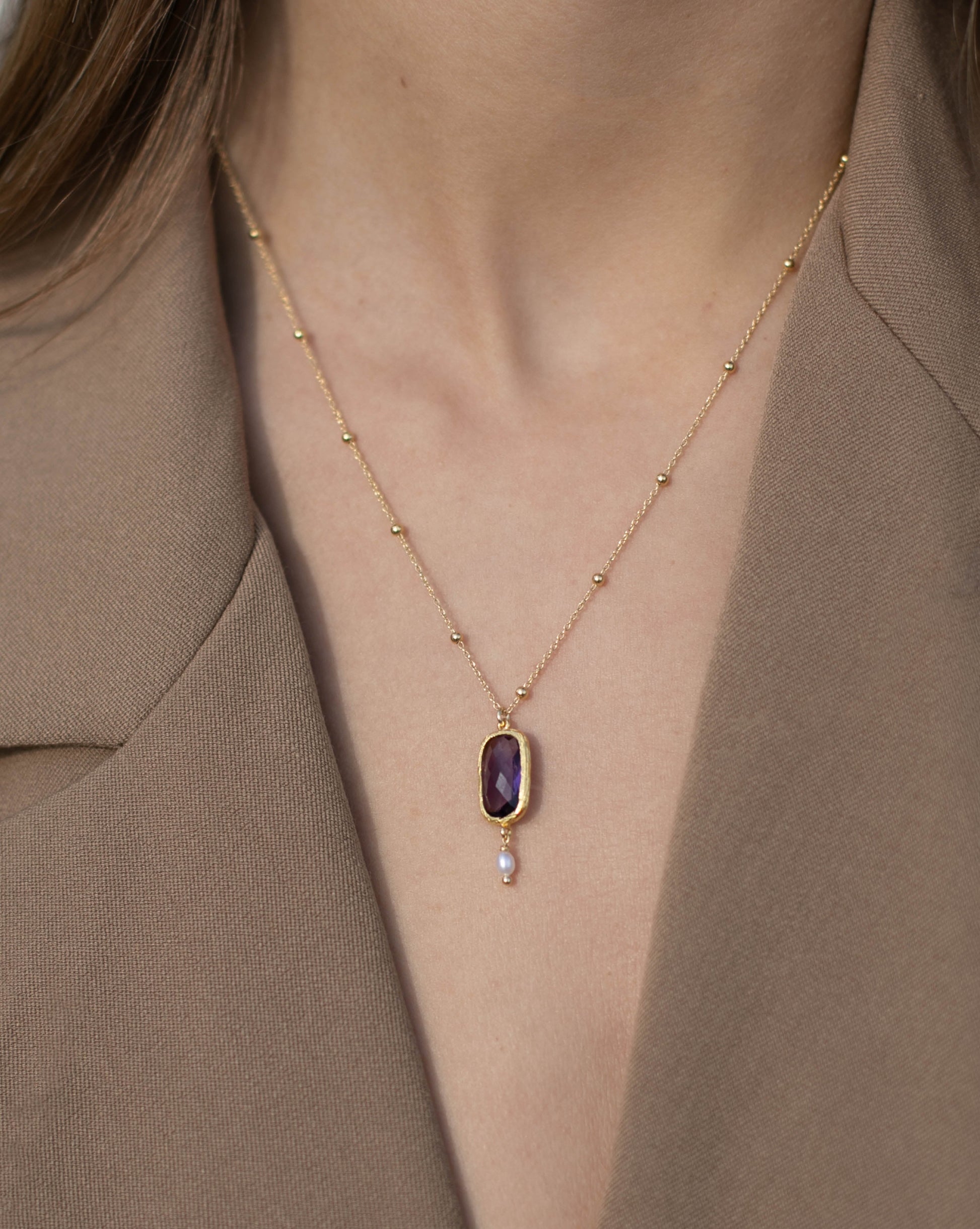 Vi presenterar JOIA, ett elegant halsband med en ametistpendant inspirerad av en talisman, prydd med en charm av rispärla. Ett magiskt och livfullt stycke, perfekt för att sticka ut på egen hand eller lager-på-lager med dina favoritskatter. Noggrant utvalda stenar.