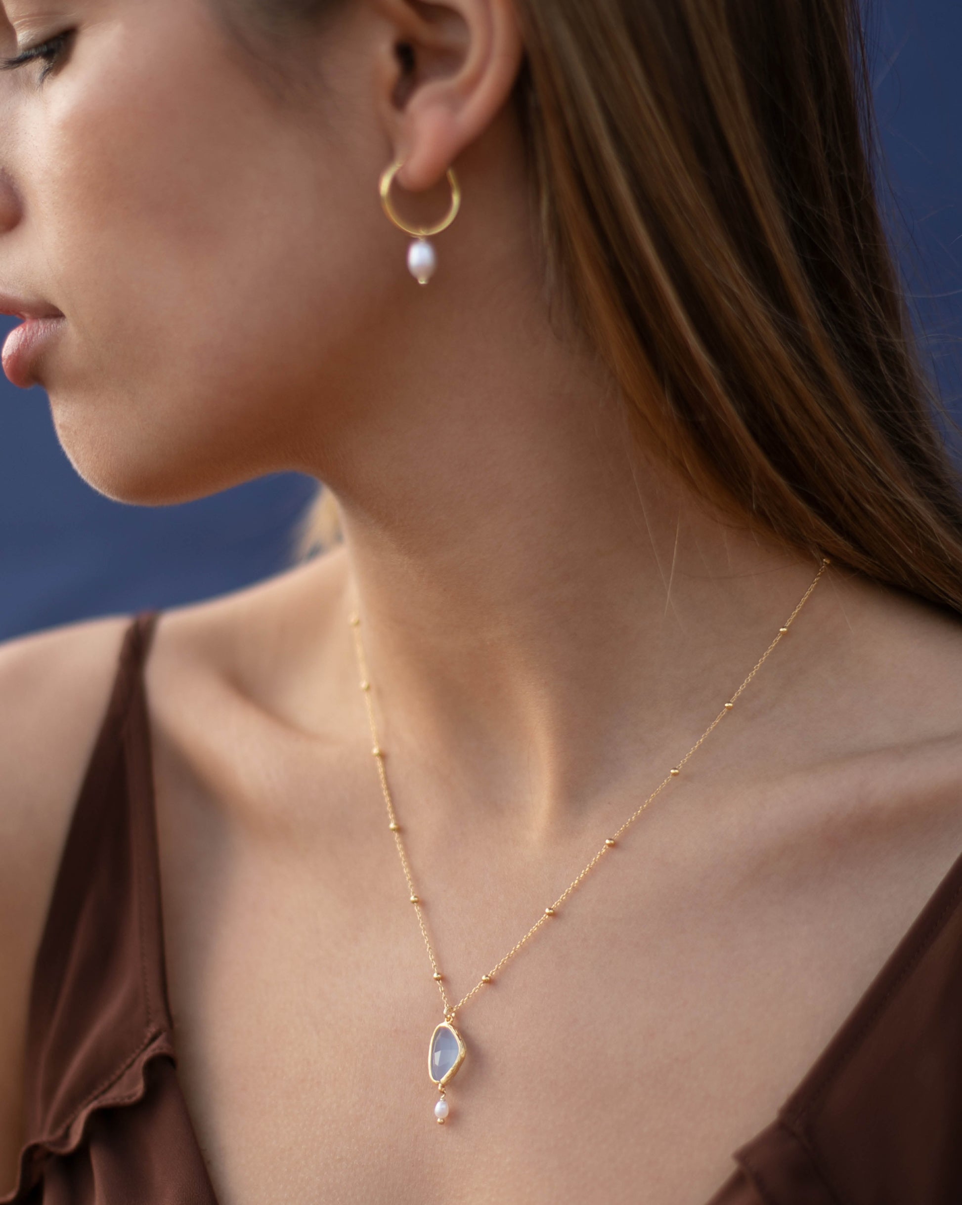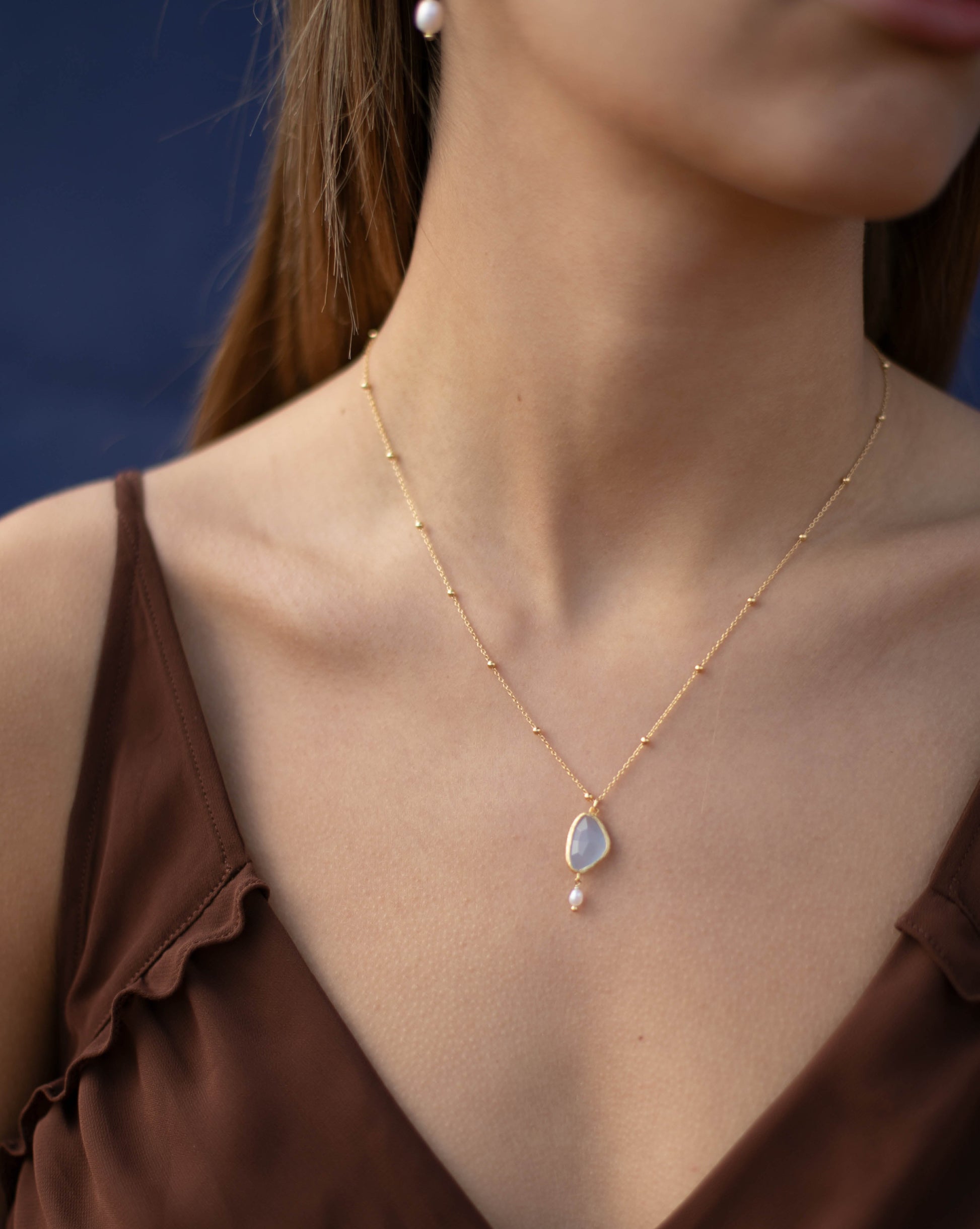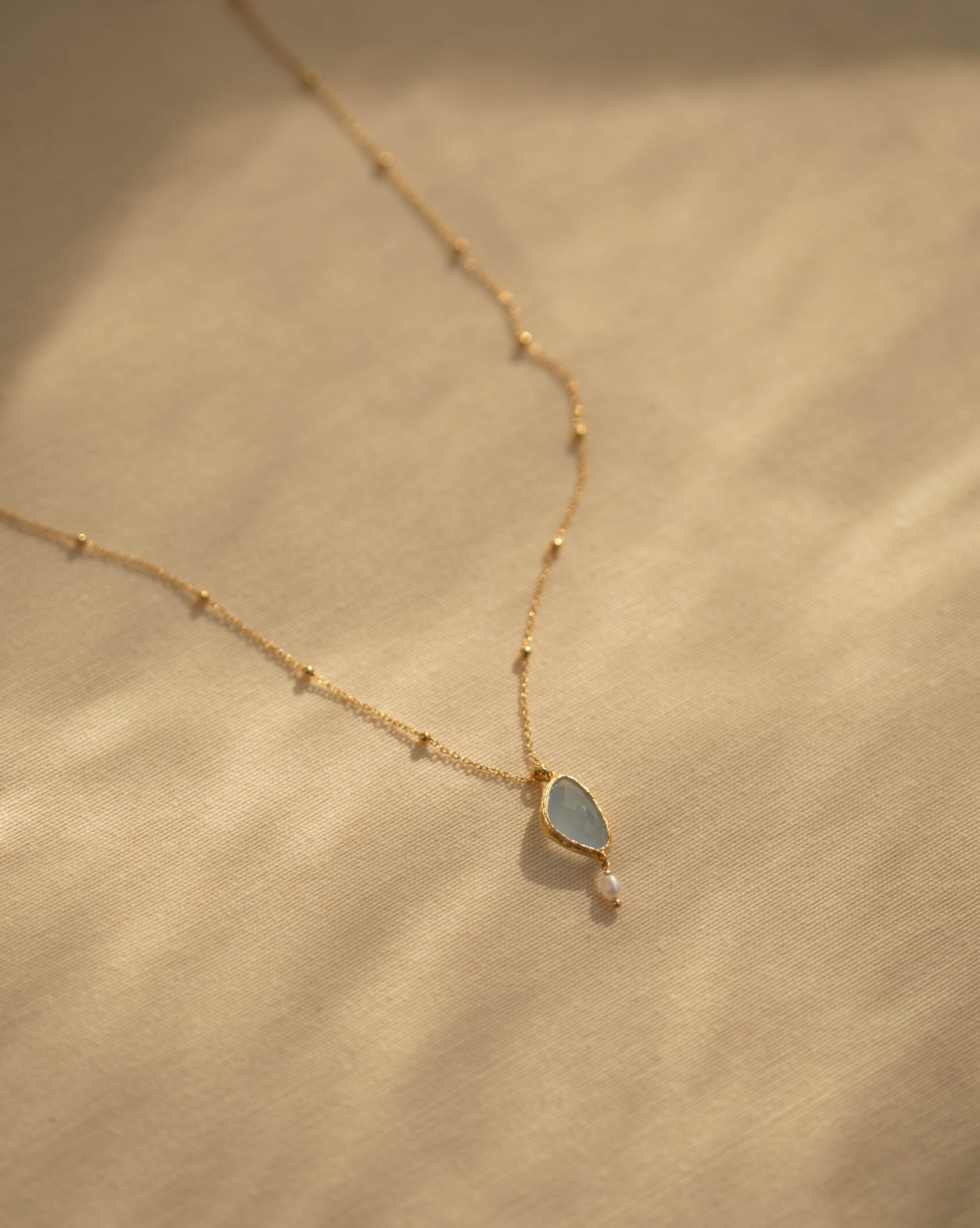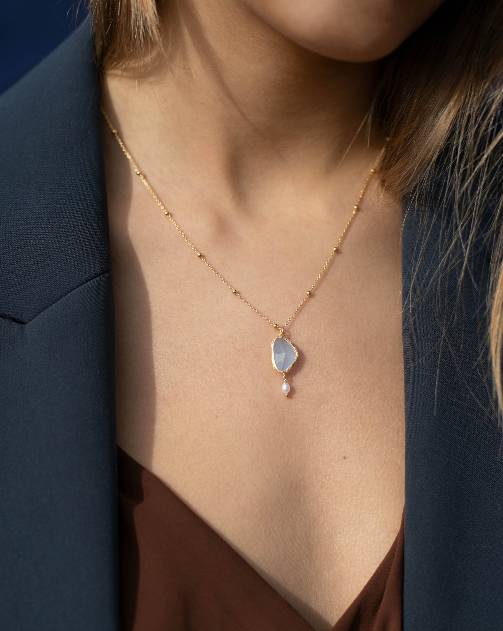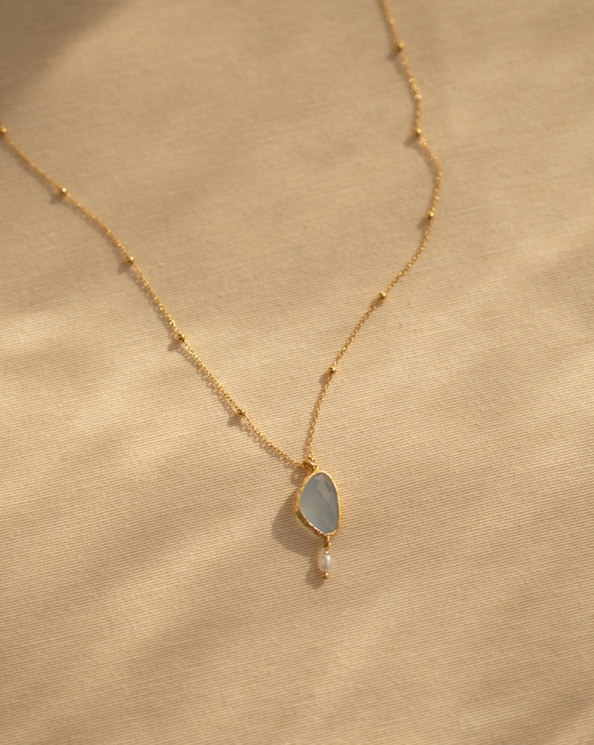 Vi presenterar JOIA, ett fint halsband med en hänge av blå kvarts inspirerat av en talisman, prytt med en charm av rispärla. Ett magiskt och livfullt stycke som står ut på egen hand eller kan bäras i lager med dina favoritskatter. Noggrant utvalda stenar.