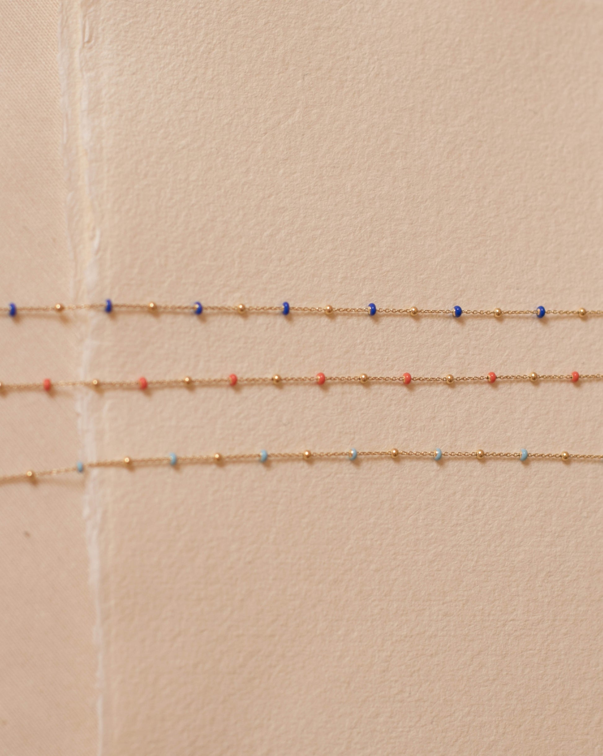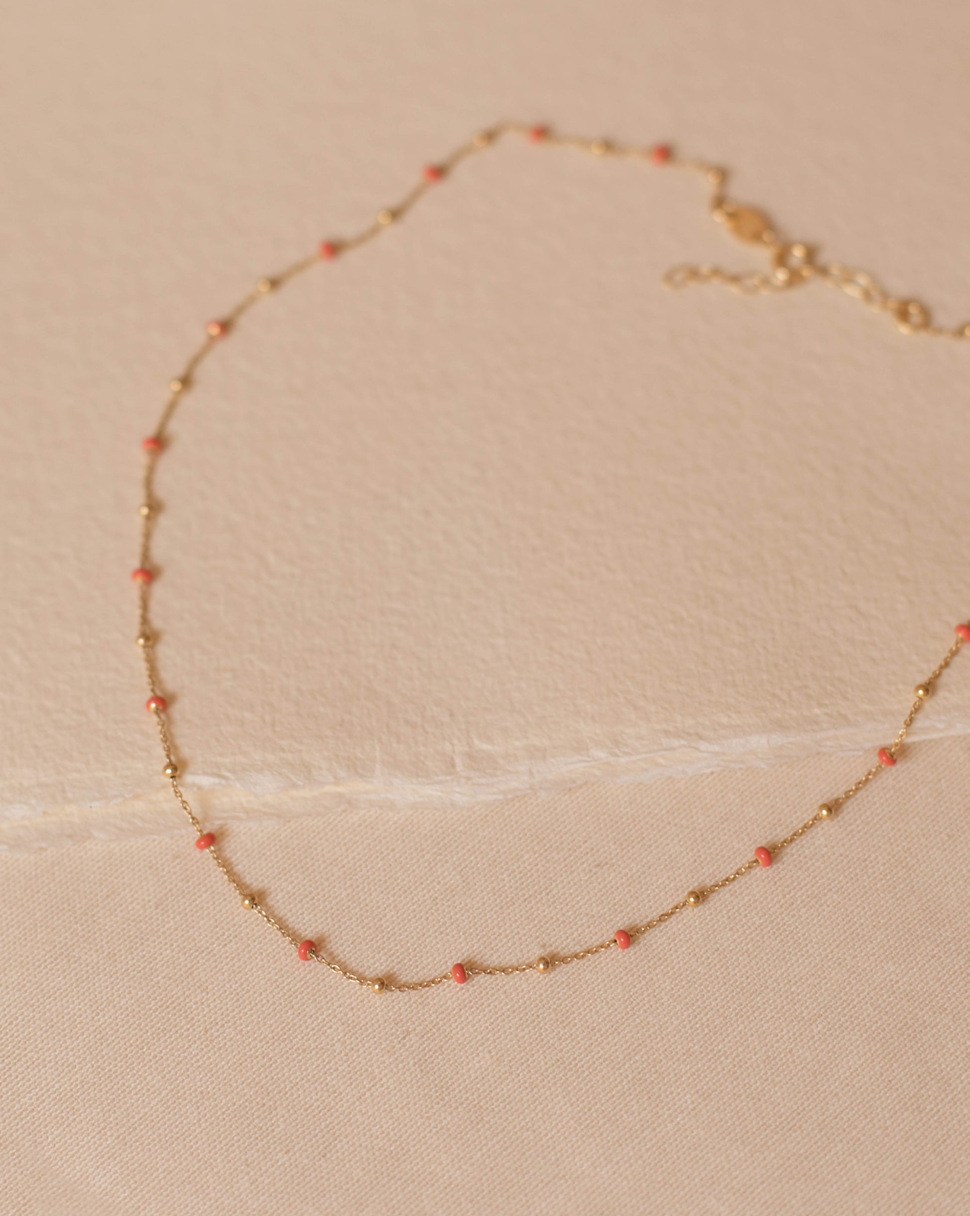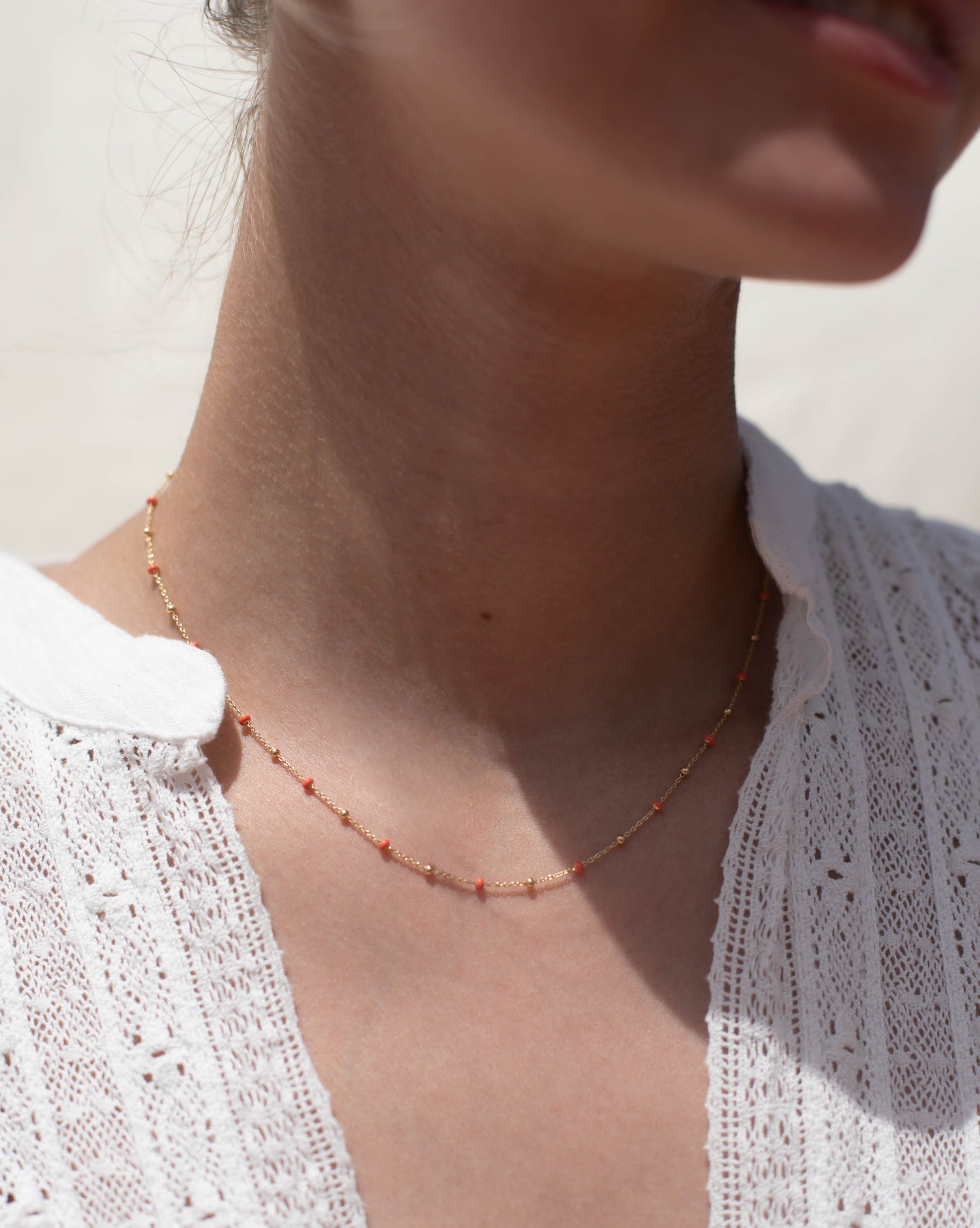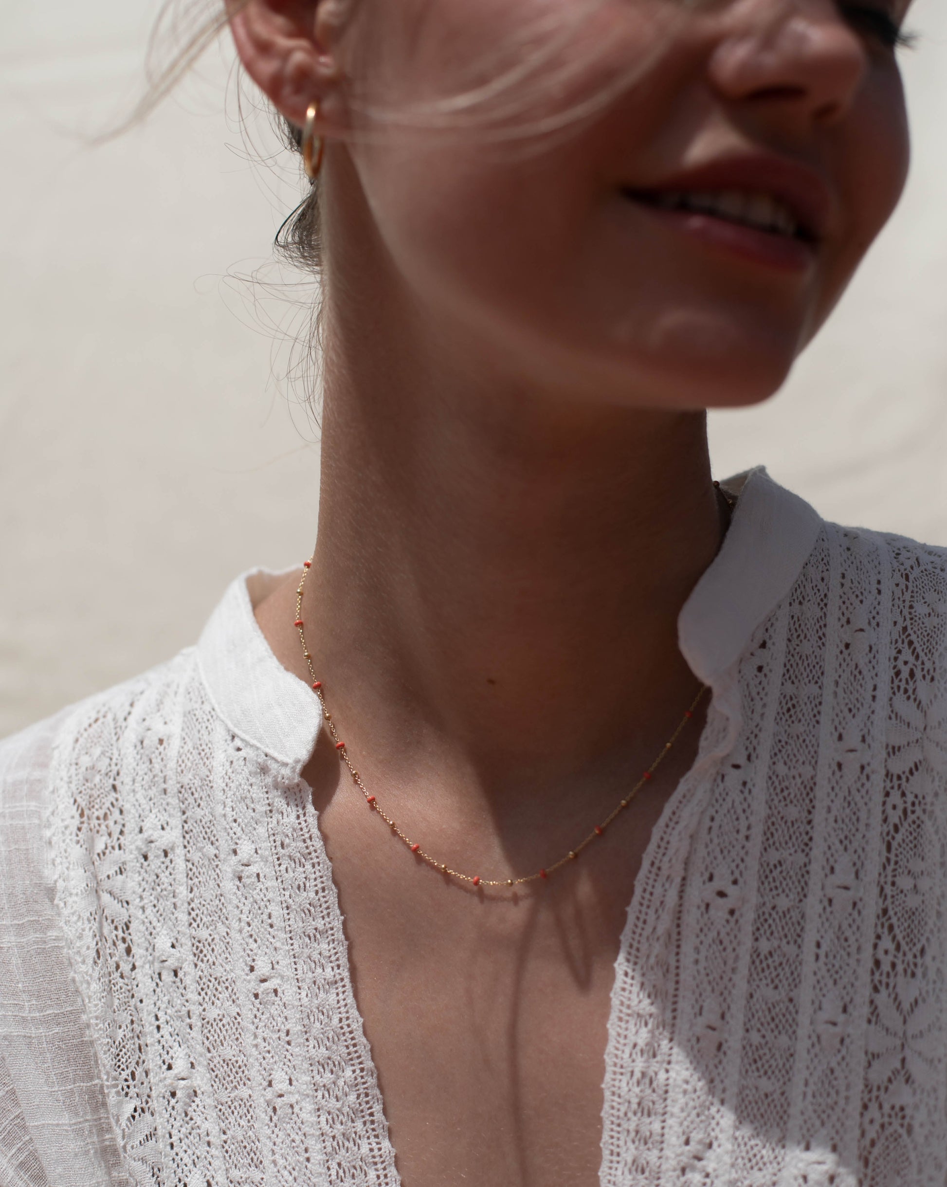 Färga dina dagar med LOULOU! Detta färgglada halsband är gjort med ett fint guldhalsband, dekorerat med korall-emalj. Personifierat med vår logotyp på låset. Bär det dagligen, överlagrat med dina favoritkedjor.