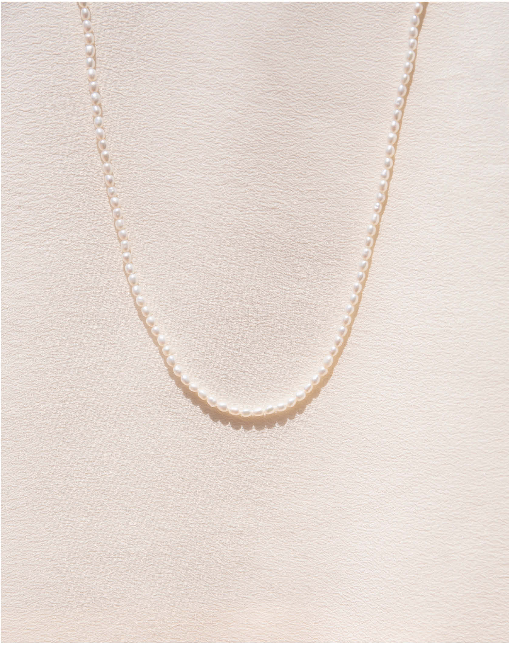 Handgjort av naturliga pärlor och anpassat med vår logotyp på låset. Bär det ensam för en subtil och feminin touch. En speciell detalj att bära för alltid.