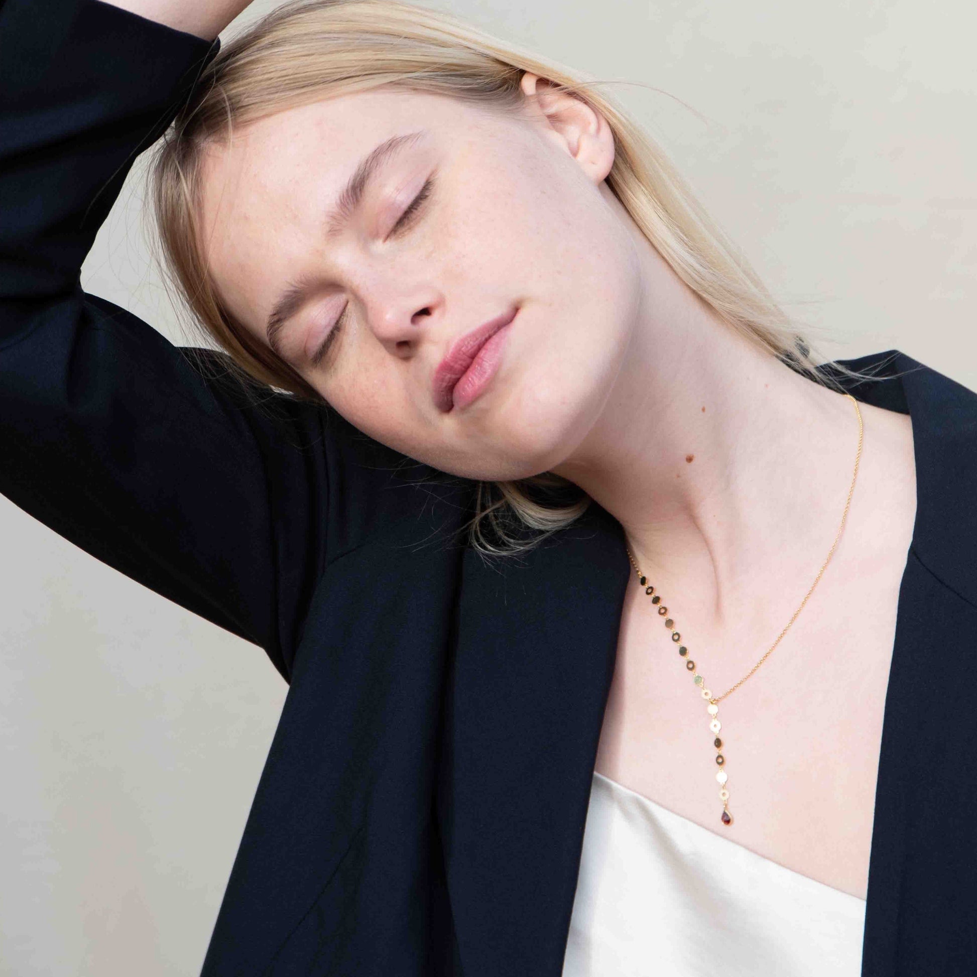 GABI är ett exklusivt smycke från French Toasts. Ett handgjort romantiskt halsband i Spanien, prytt med en granatsten.
