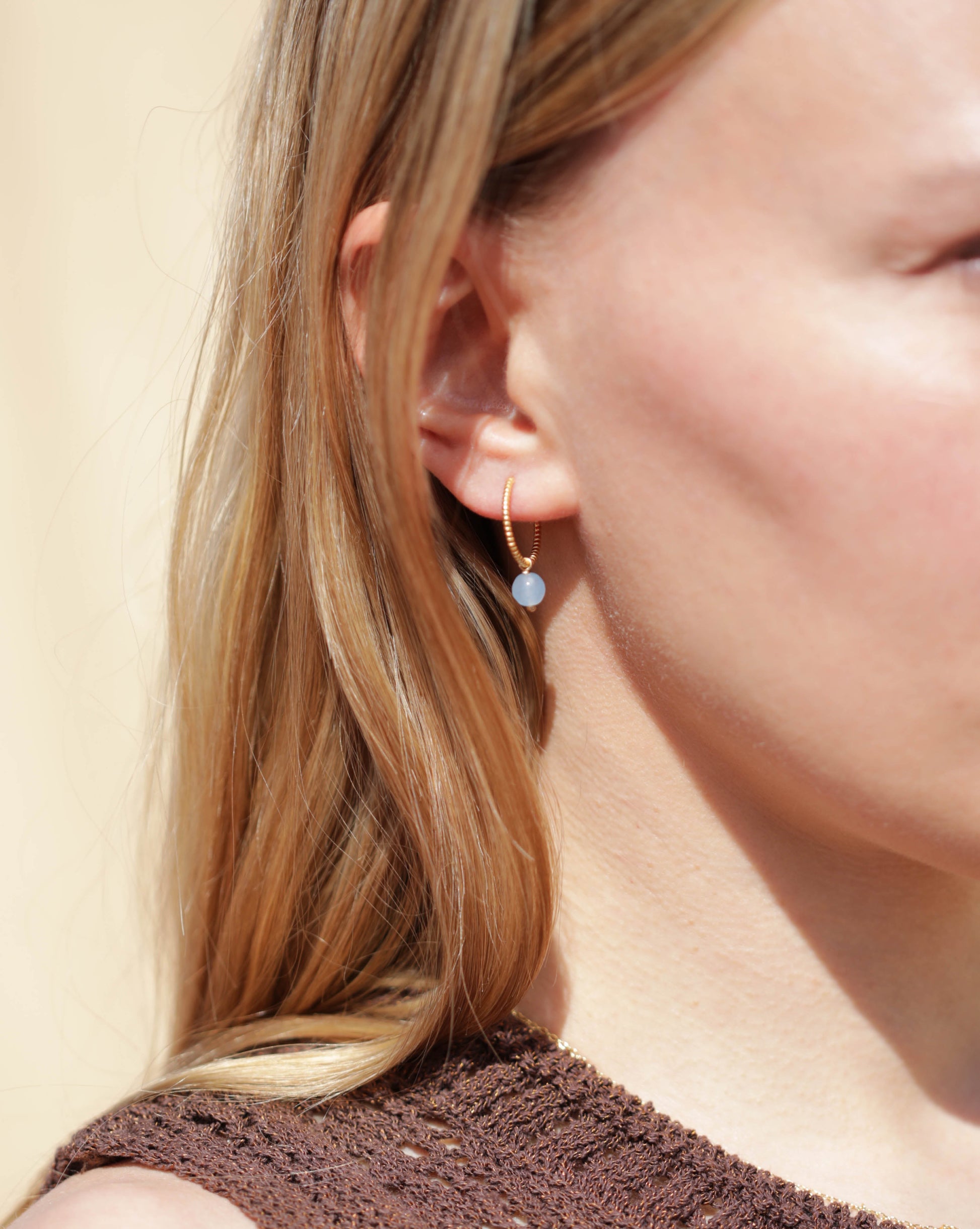 Vi presenterar JANE med en explosion av färg. Ett delikat par örhängen i fint guldflätat, prytt med ljusblå stenar. En exklusiv design från French Toasts. Alltid elegant och tidlös. En mångsidig pjäs för alla tillfällen.