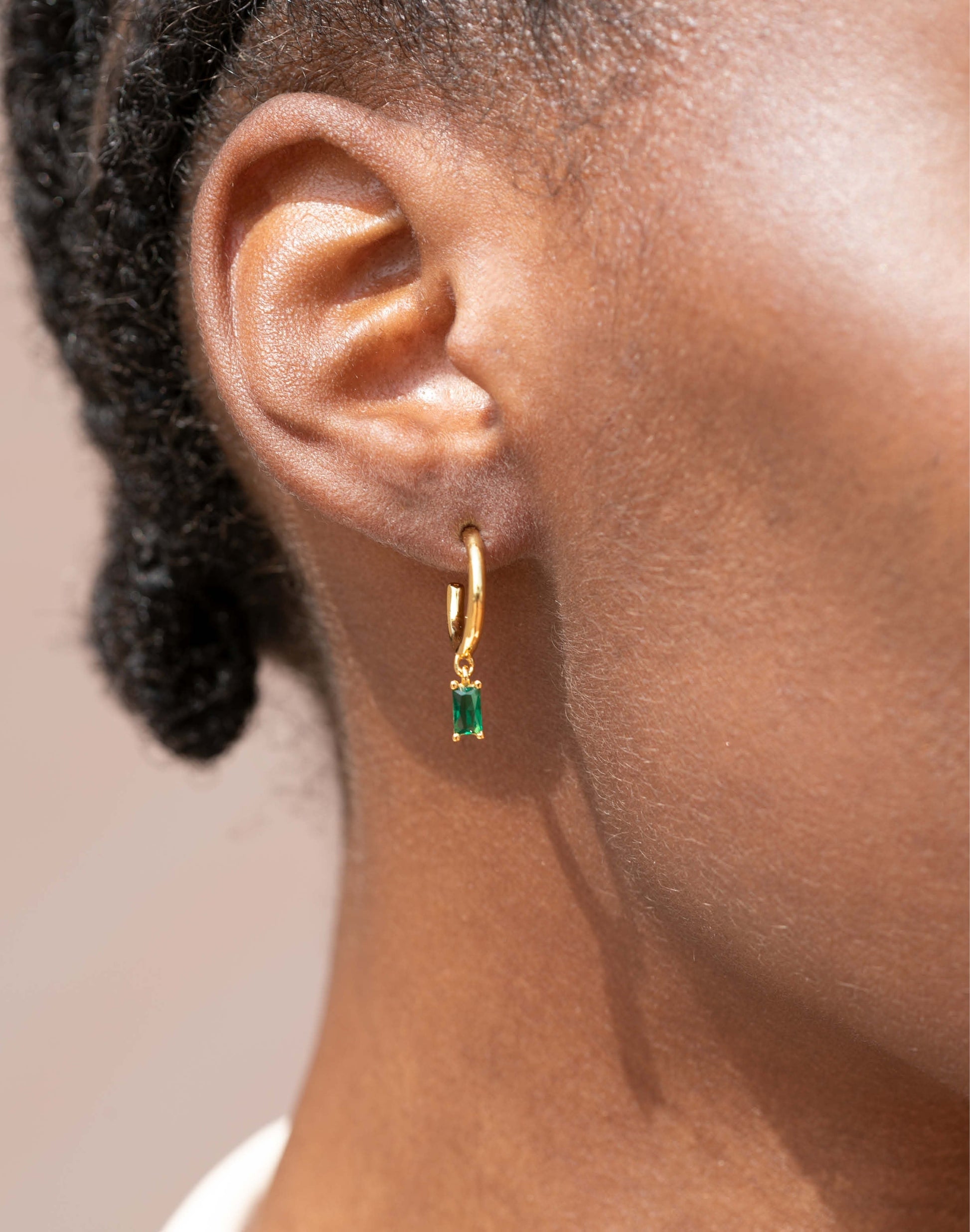 MIA är ett medeltjockt örhänge i guld, prytt med en smaragd zircon i baguetteform.