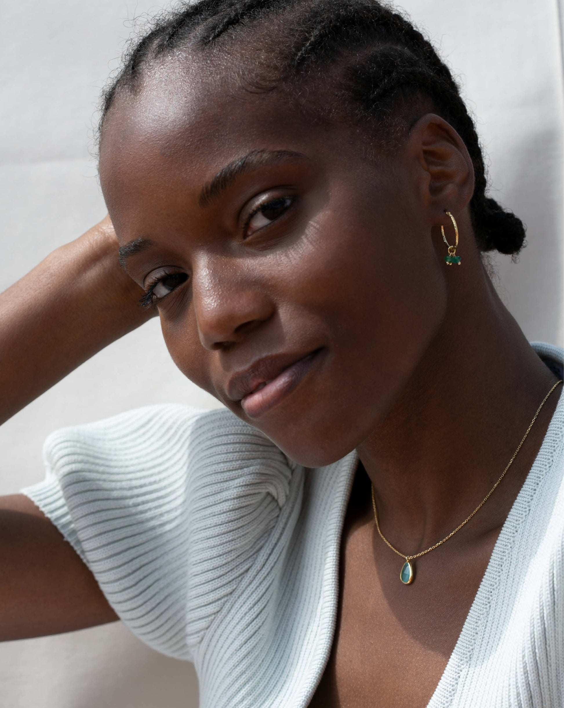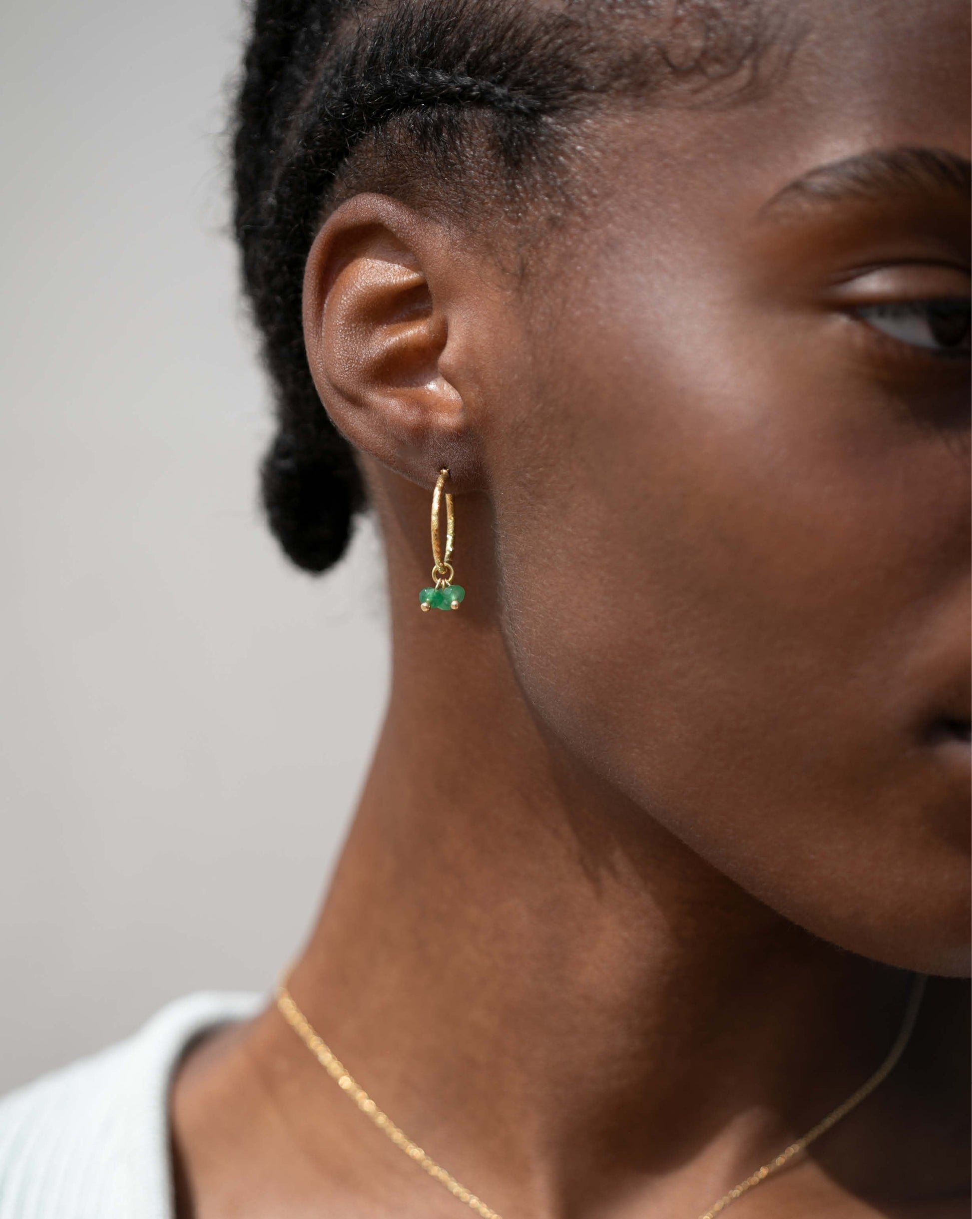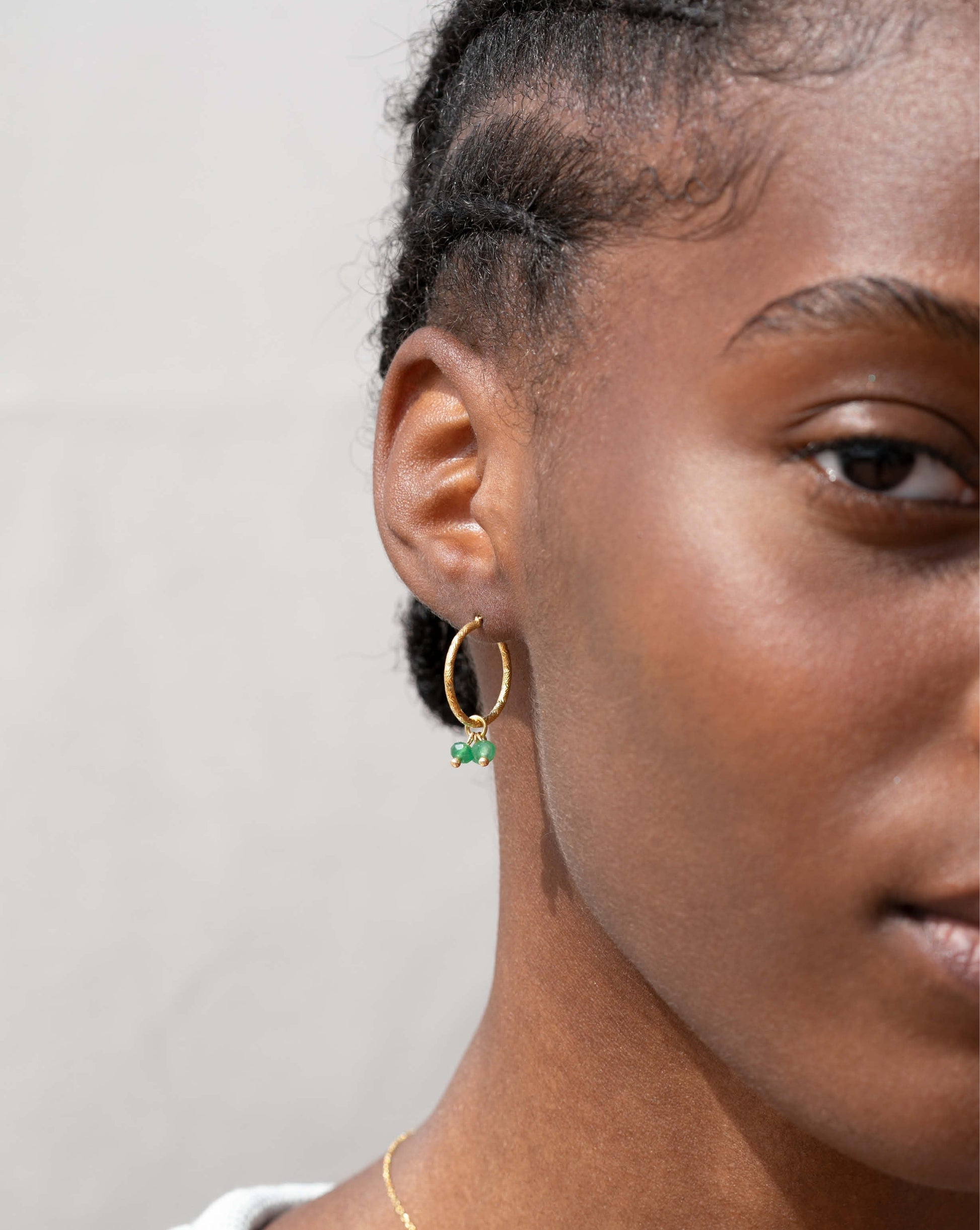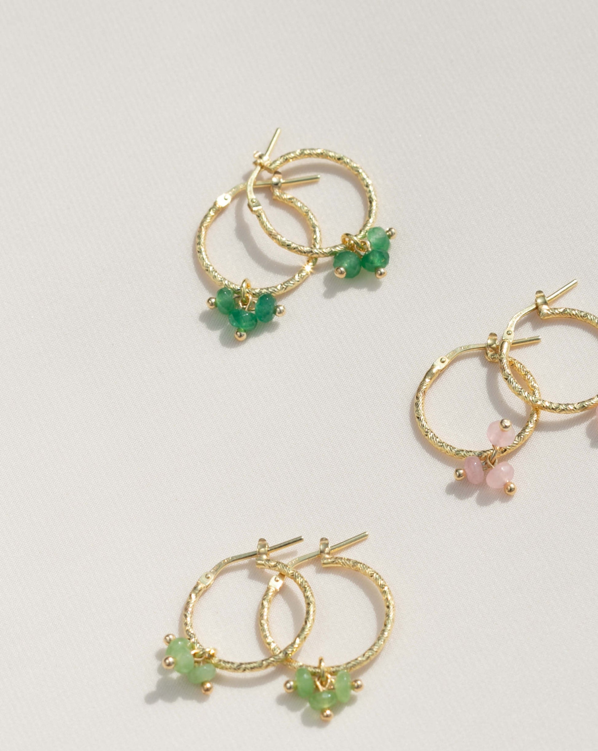 Möt PHOEBE, en mångsidig, elegant och feminin pjäs. Tillverkad av en ring i texturerat och glänsande guld, prydd med tre livfulla gröna agatstenar. De är så bekväma och lätta att du kommer vilja ha dem med dig alltid!