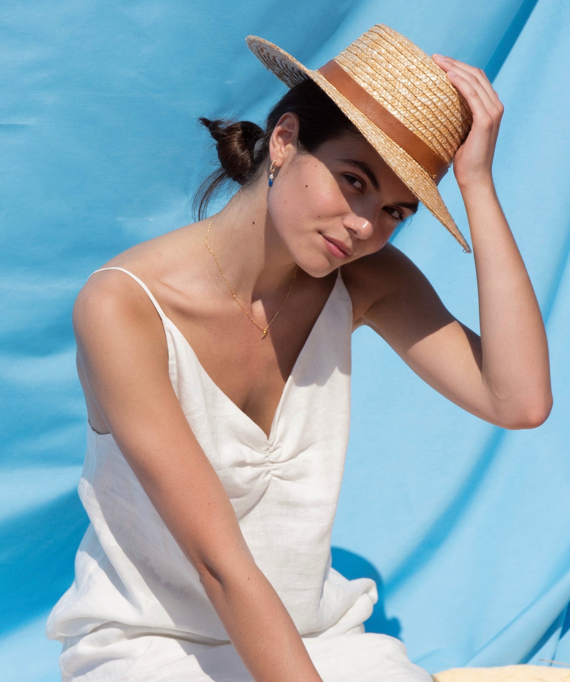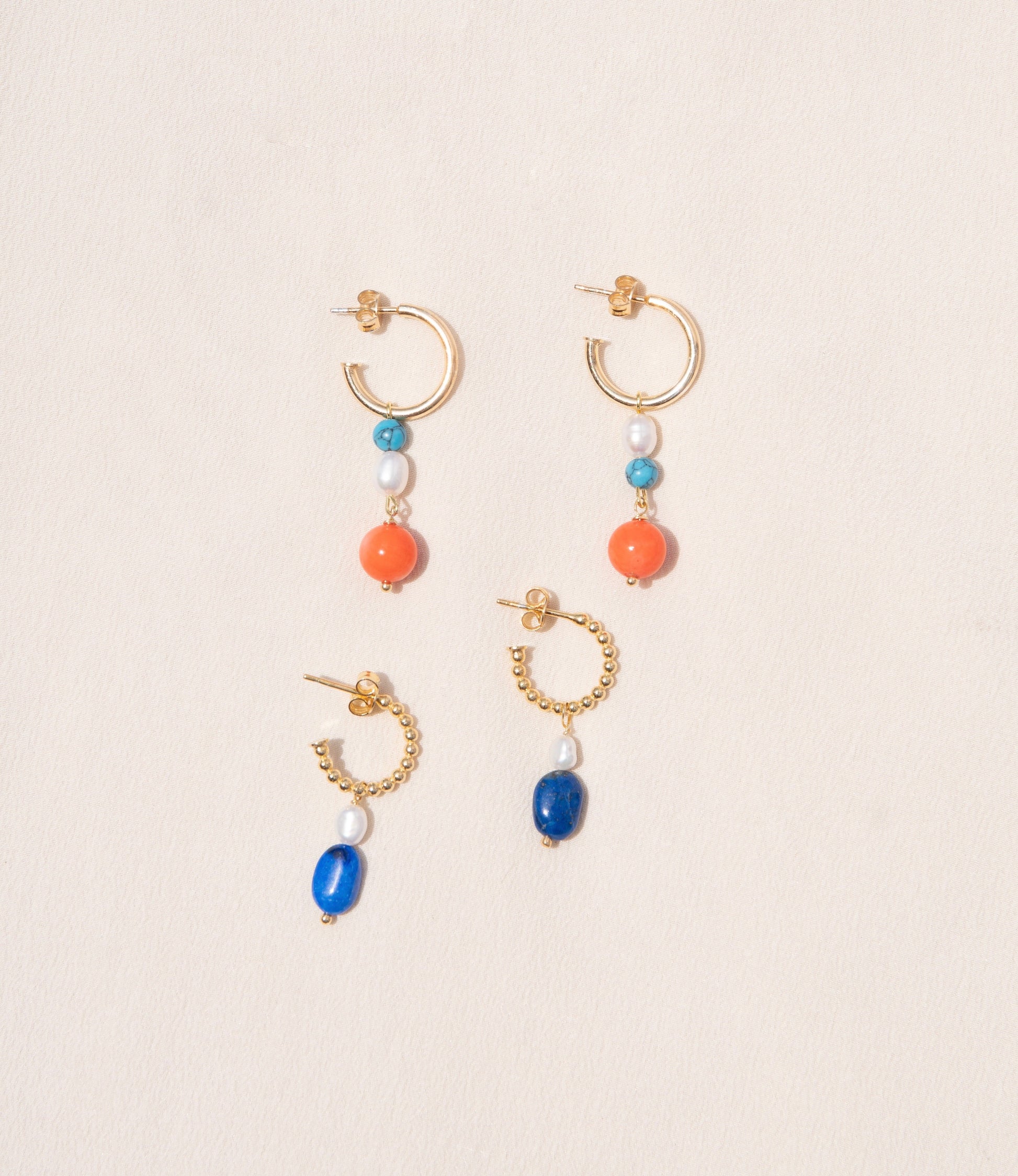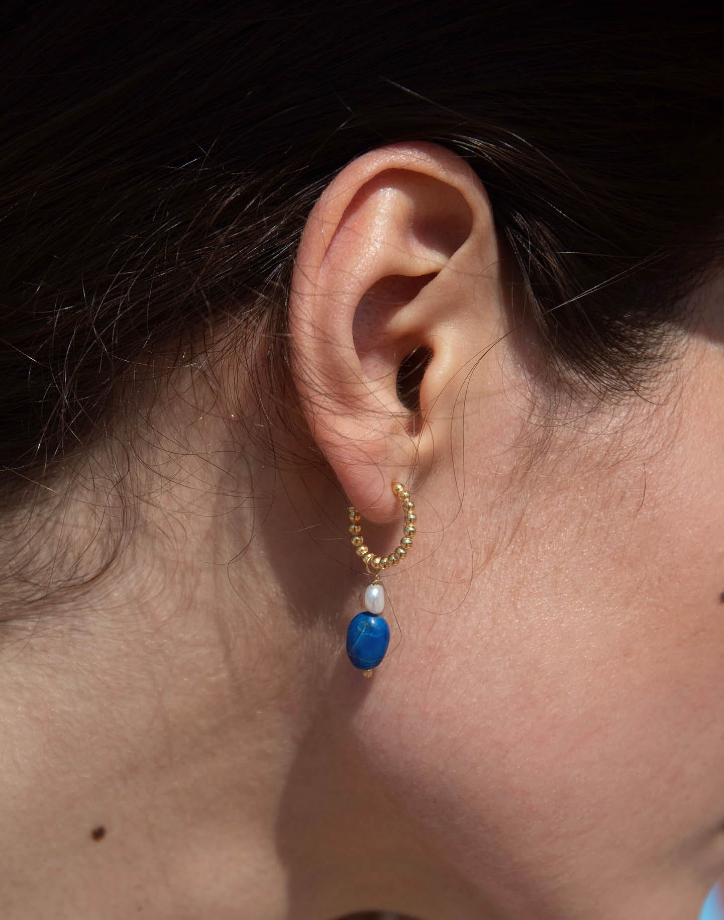 Örhängen SARDINIA är en medelhavsstycke. Detta eleganta par örhängen med hängande ringar är tillverkat med naturliga pärlor som kontrasterar med en blå agatsten. Ett speciellt stycke perfekt för de långa sommardagarna.