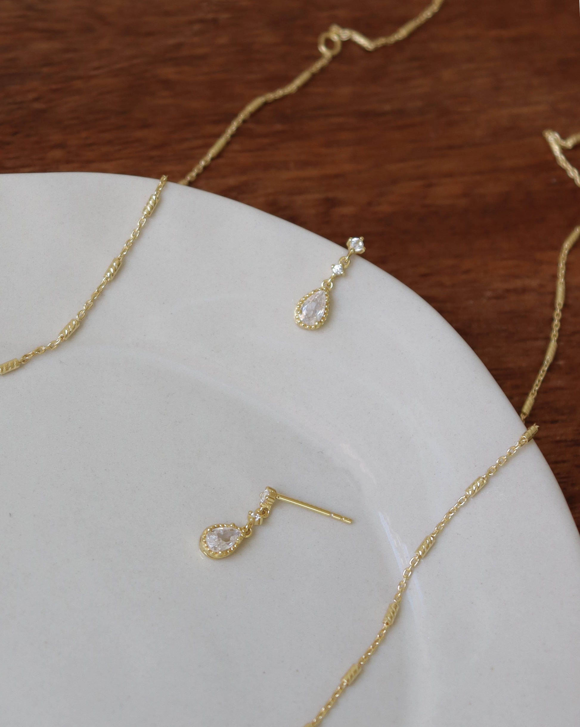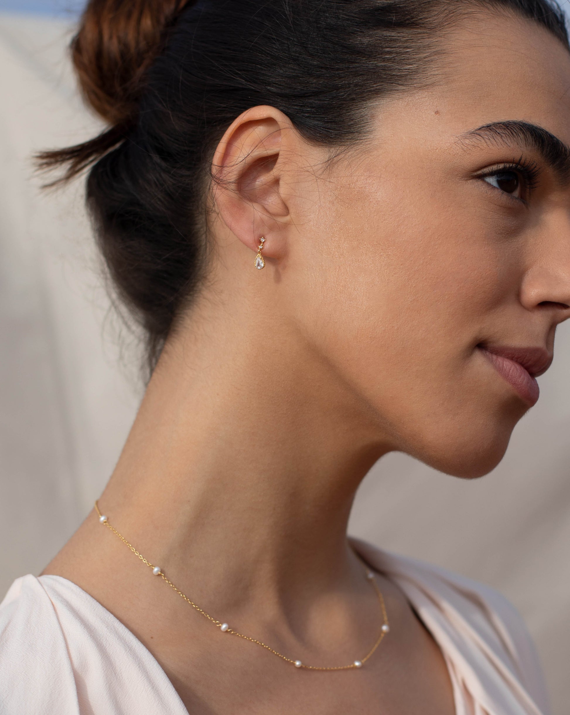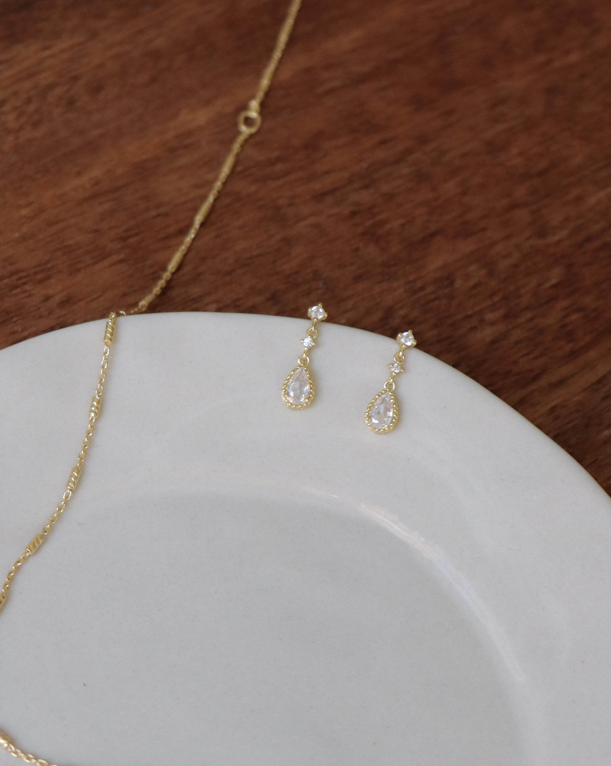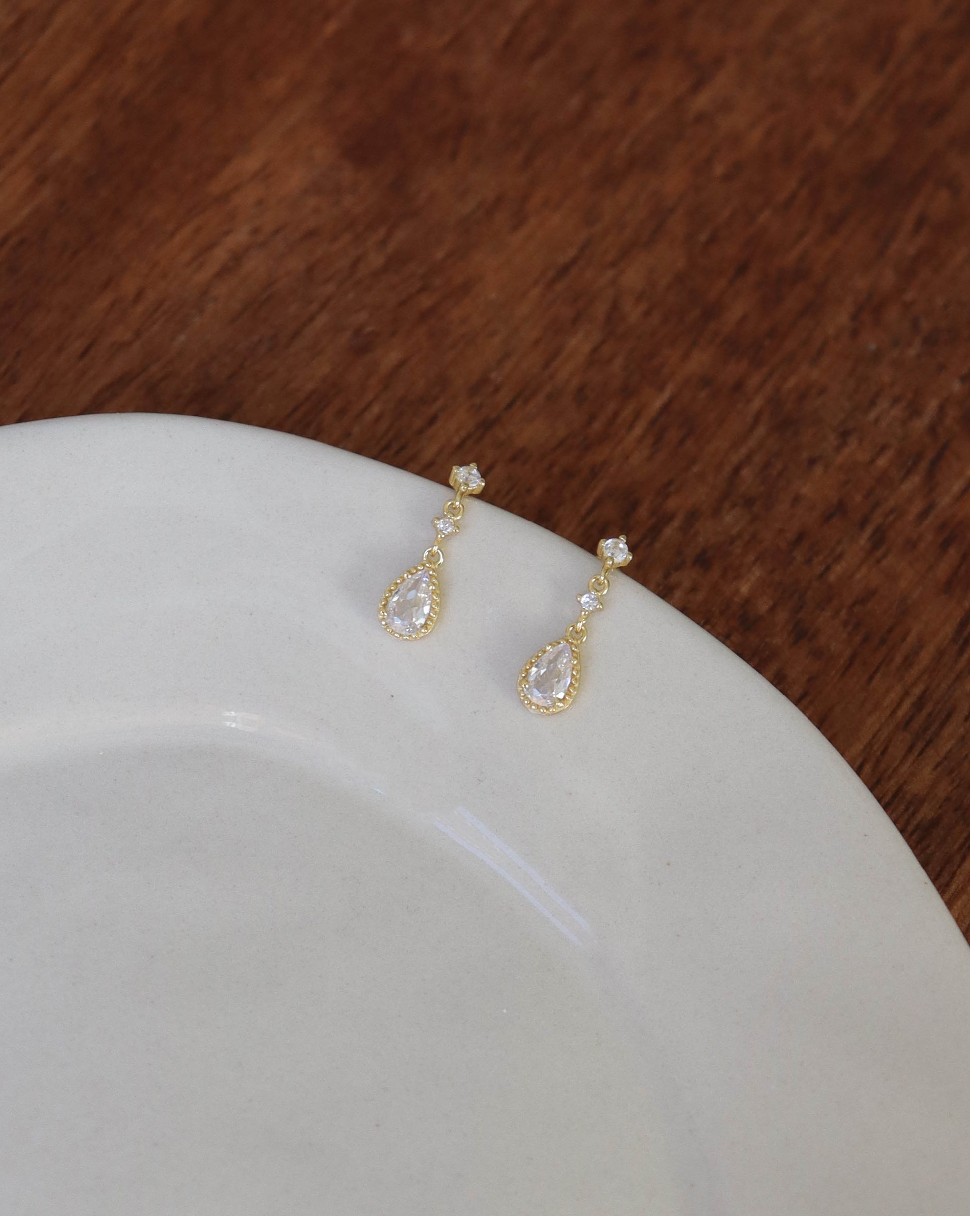 Vi presenterar TESS, ett par eleganta örhängen med päronformad zirkon som framhävs av två toppzirkoner.