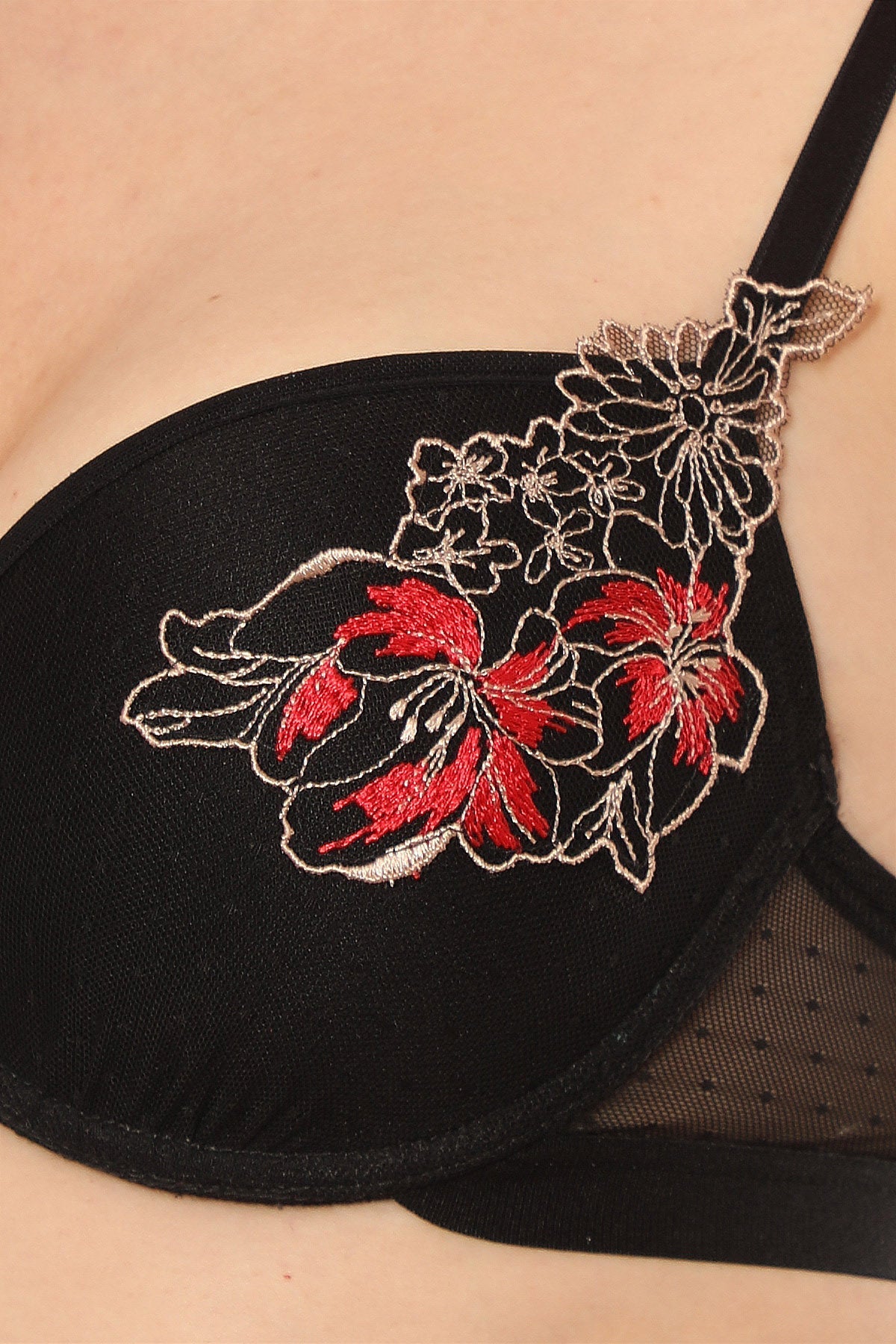 Push-up bh från kollektionen Tasmine, tillverkad av fin tulle dekorerad med blommönster, ger volym och en spektakulär dekolletage. Perfekt för att lägga till en extra touch av elegans och femininitet.