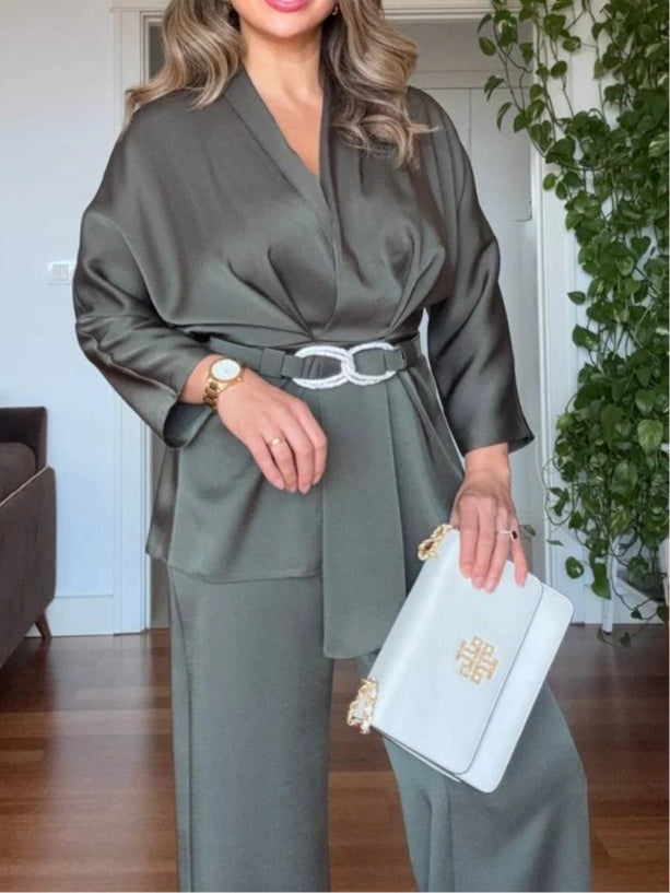 Satinset med utsvängda byxor och V-ringning