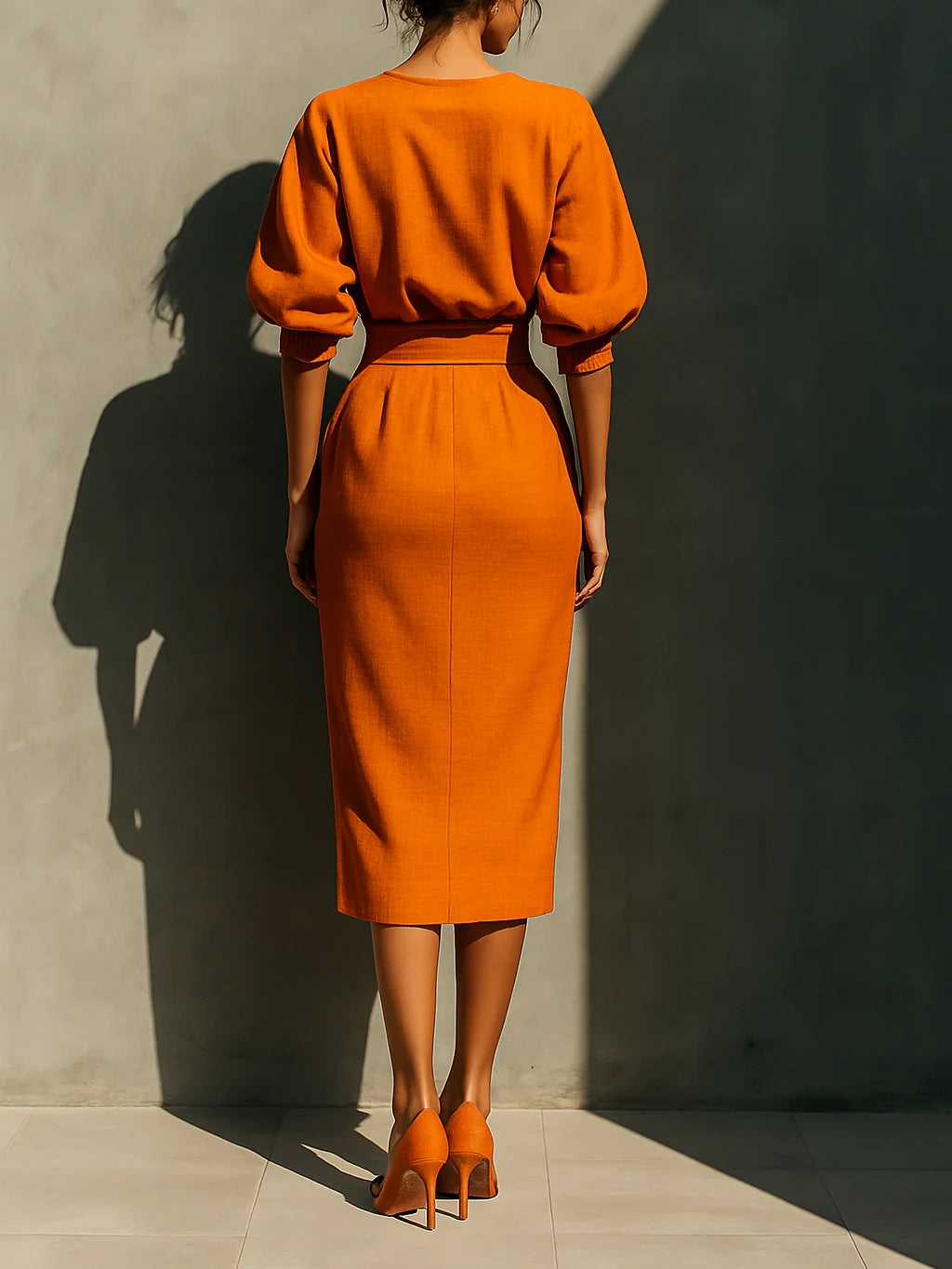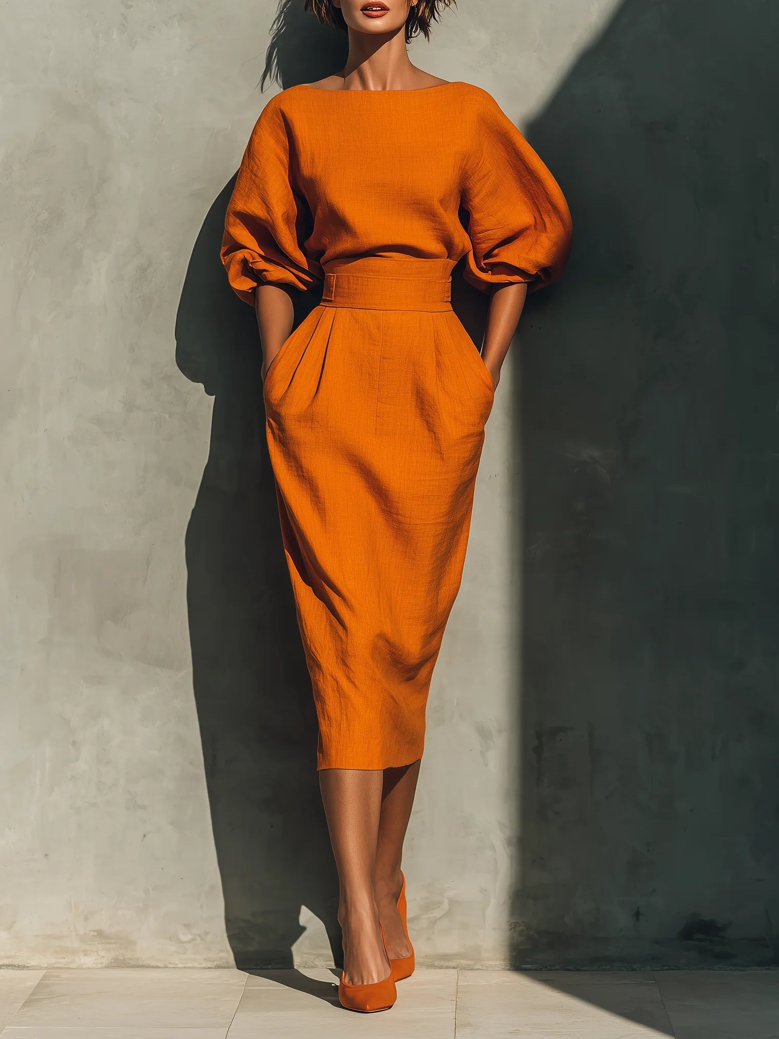 Sätt med en livfull midi kjol i bomull och lin i orange