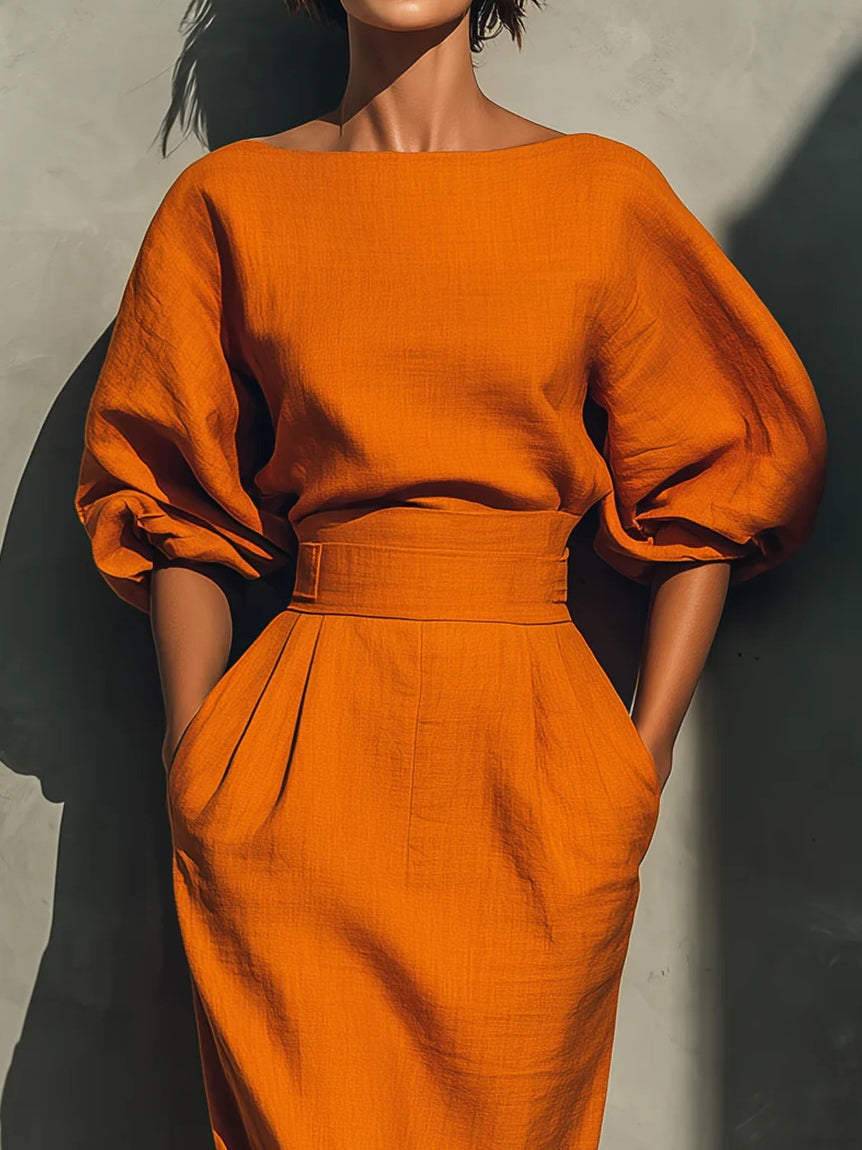 Detta djärva tvådelade set inkluderar en strukturerad topp med statementärmar och en matchande midi kjol. Tillverkad av andningsbar bomull och lin, är det både elegant och bekvämt att bära hela dagen.