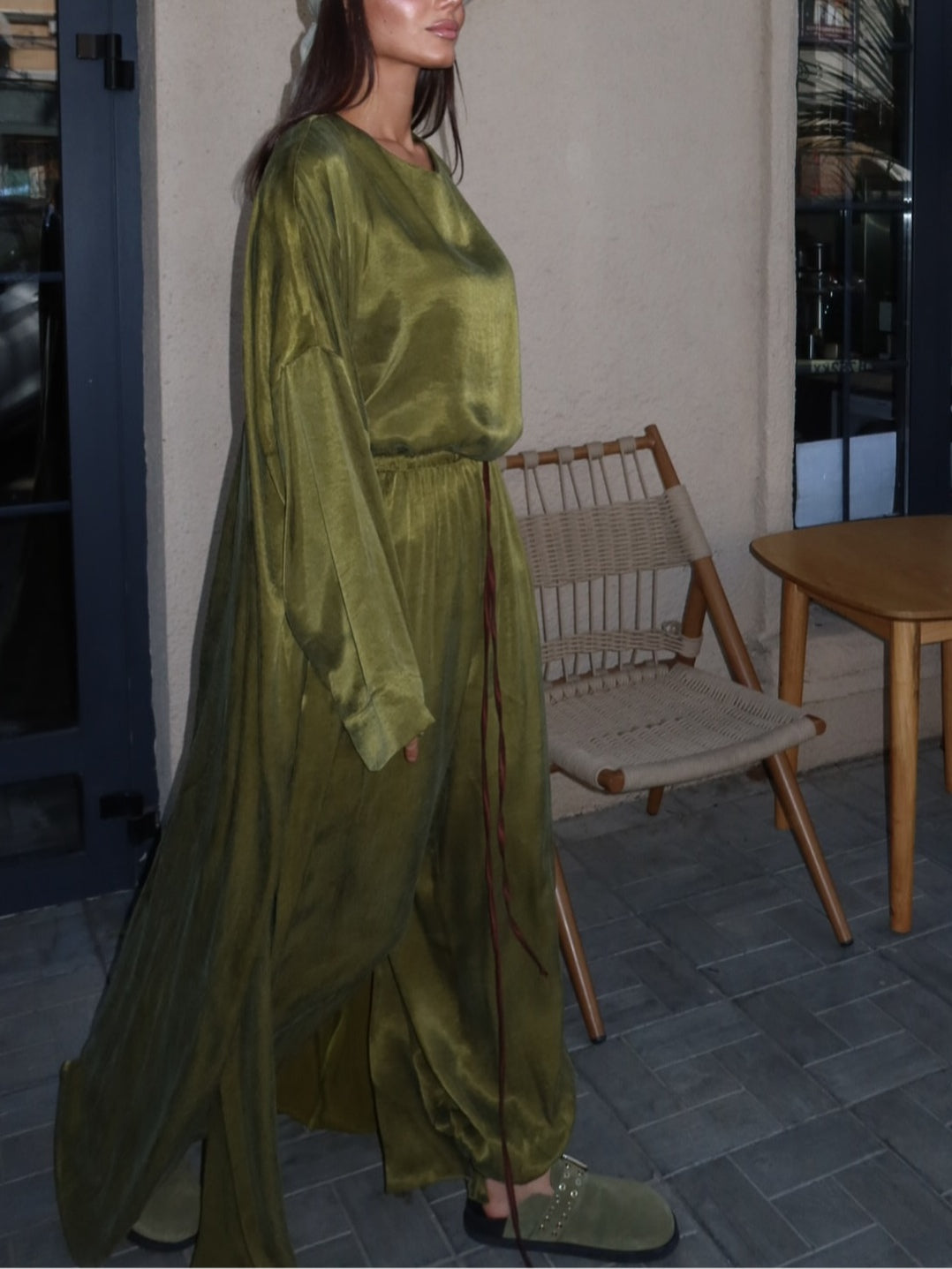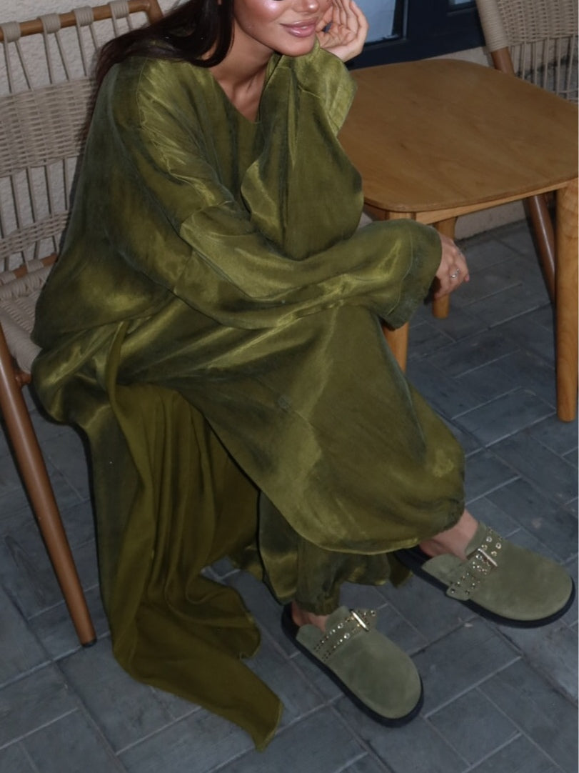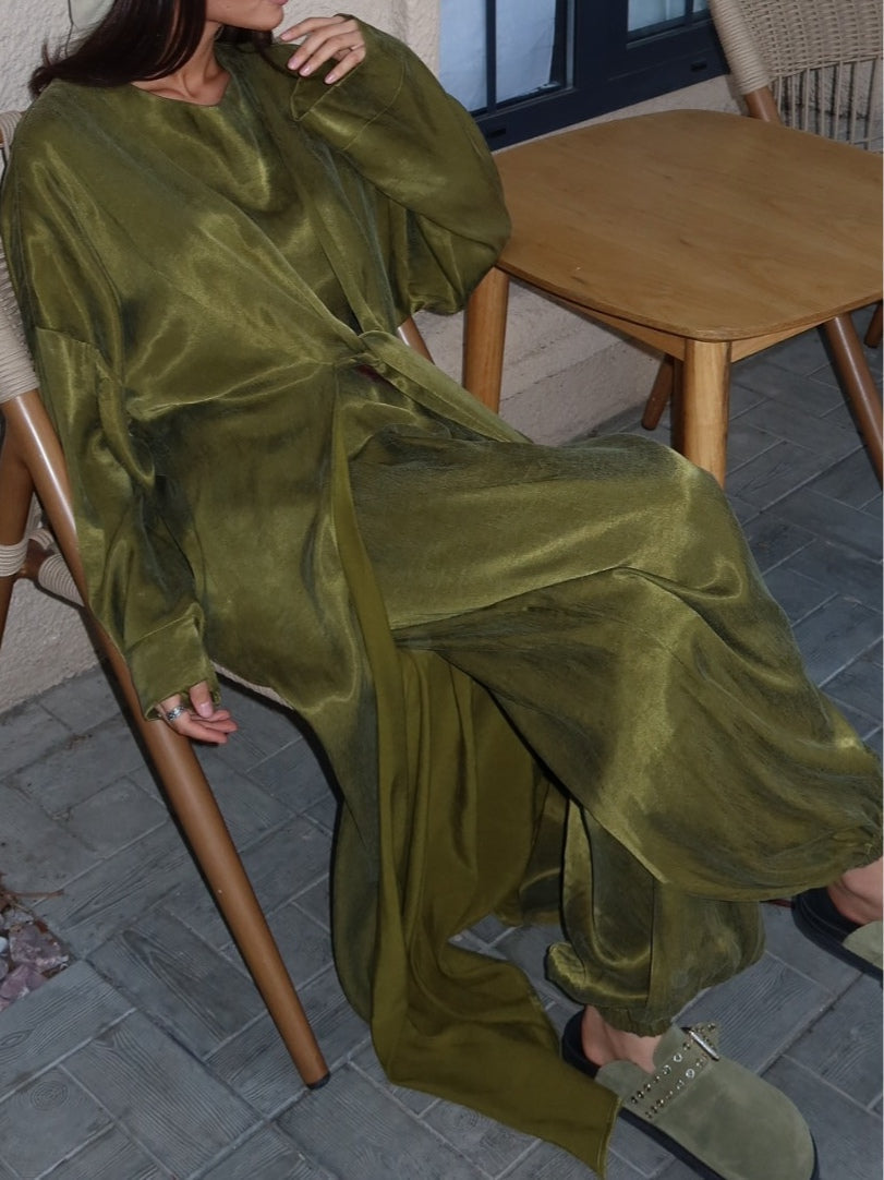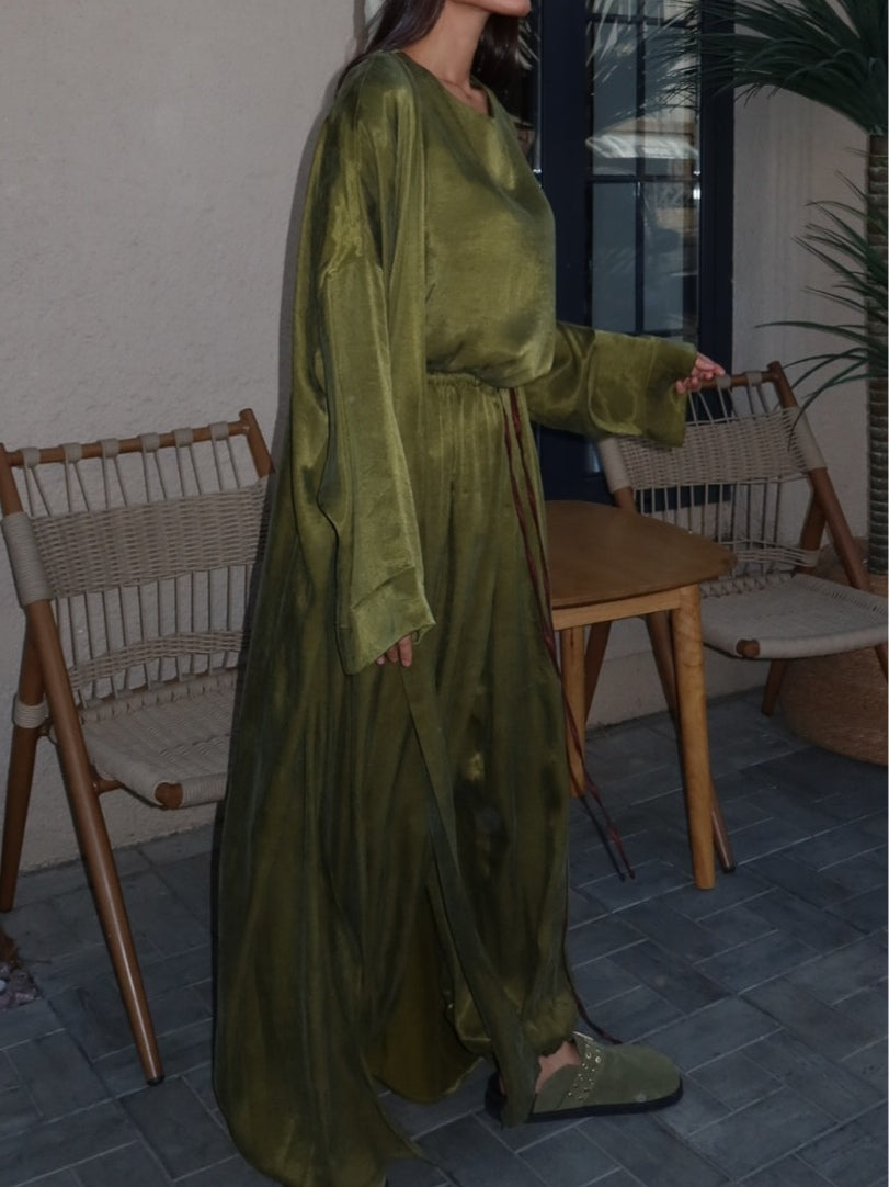 Set med tre delar i grön satin för hösten