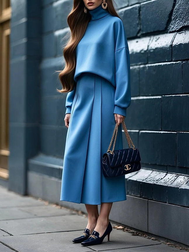Set med två delar: Top med hög krage och midi kjol