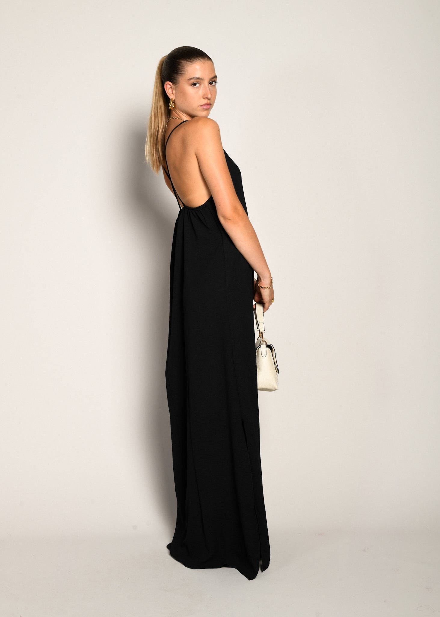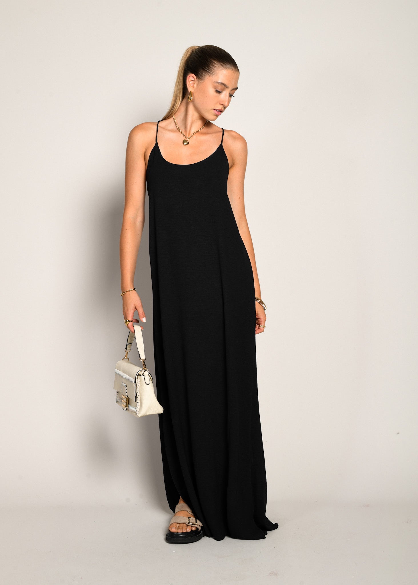 ARTIKELDETAILJER: Lång beige klänning med tunna axelband.